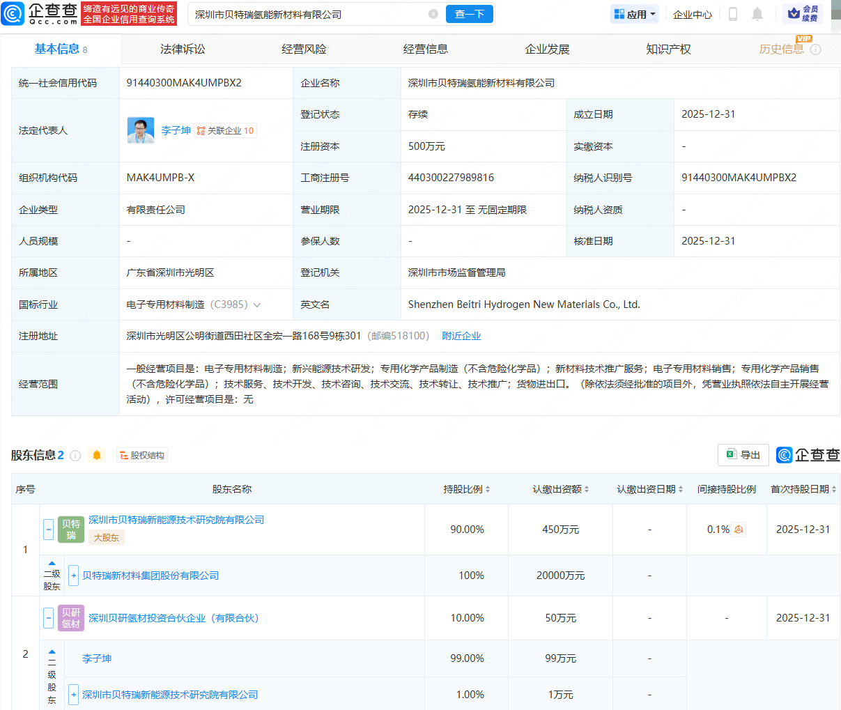 近日,深圳市贝特瑞氢能新材料有限公司成立,法定代表人为李子坤,经营范围包含:电子专用材料制造;新兴能源技术研发;新材料技术推广服务;电子专用材料销售等。企查查股权穿透显示,该公司由贝特瑞(920185)旗下深圳市贝特瑞新能源技术研究院有限公司、深圳贝研氢材投资合伙企业(有限合伙)共同持股。